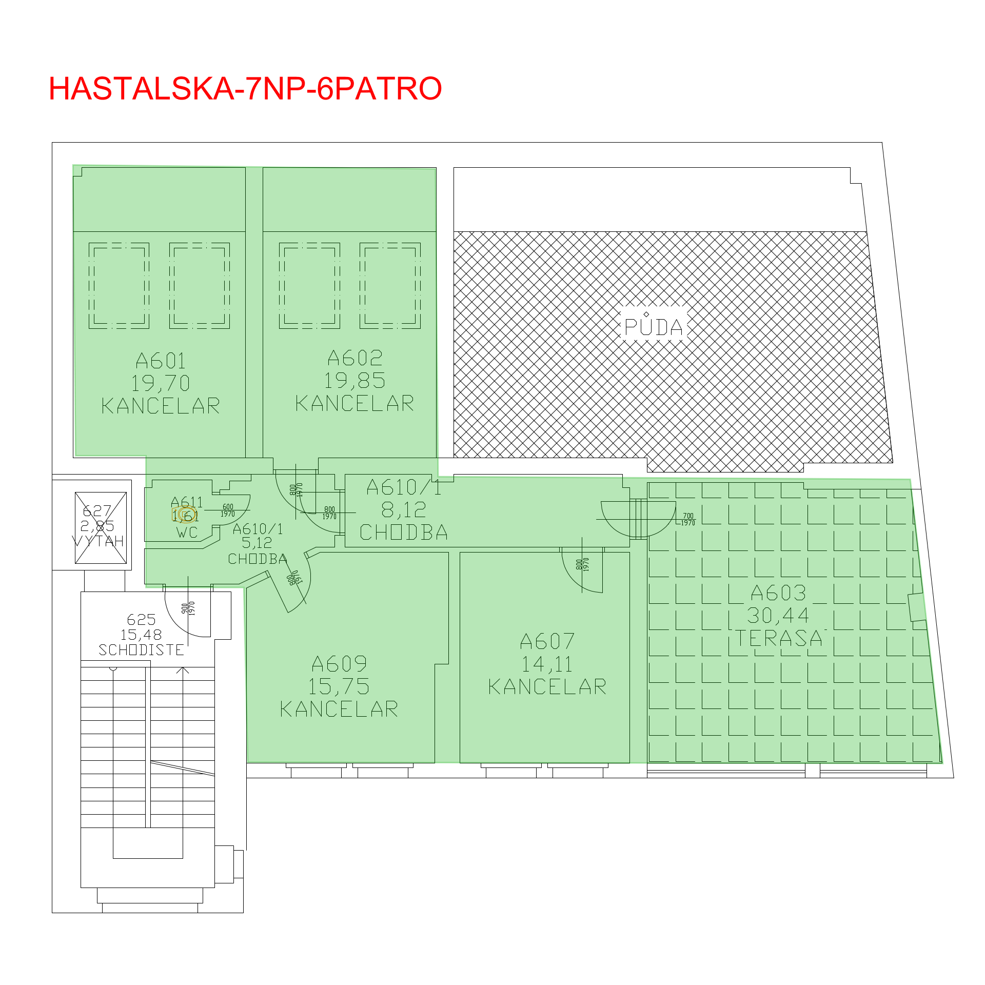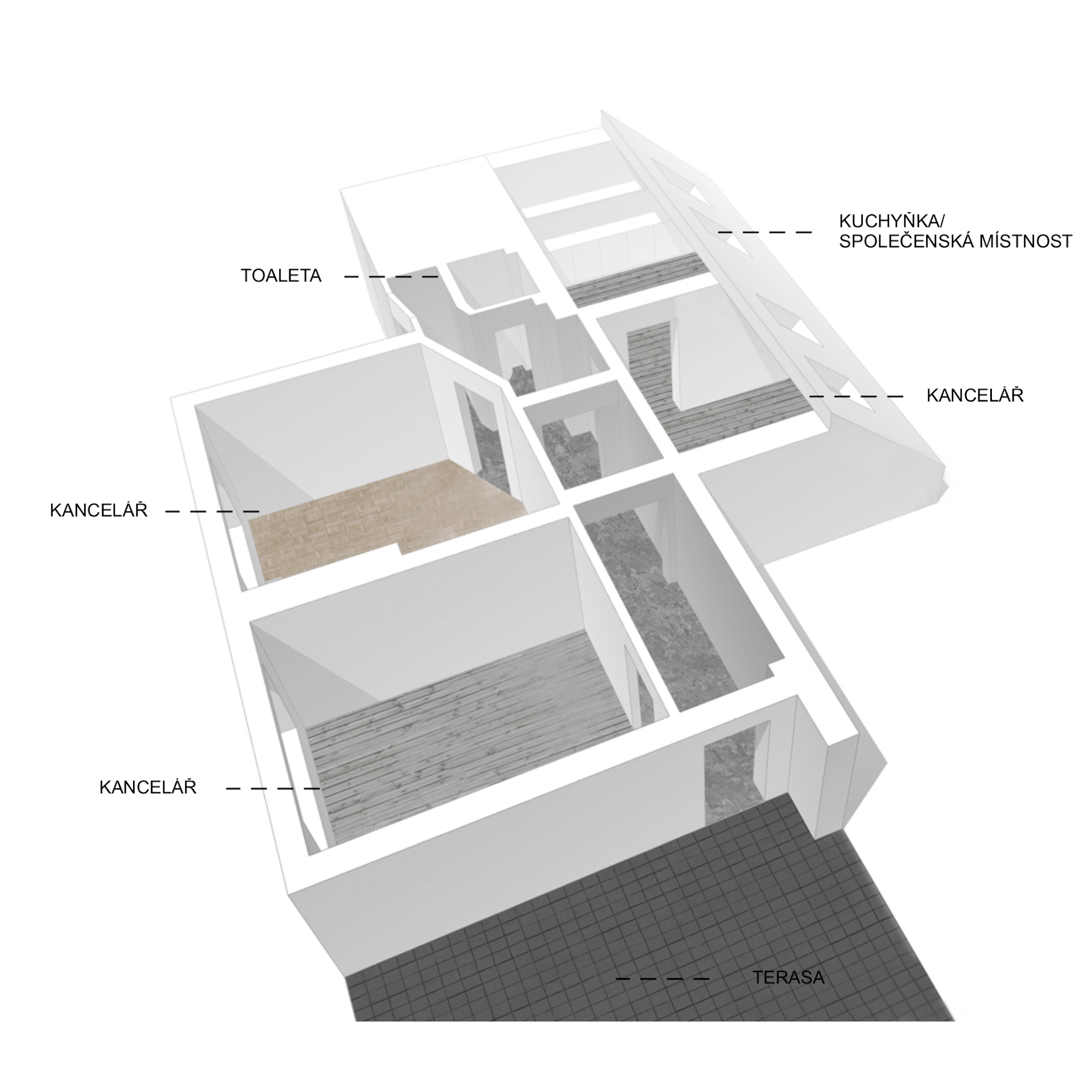 The office consists of two larger walk-through rooms (19.7 m2 and 19.9 m2) and two smaller rooms (14.1 m2 and 15.6 m2), a corridor and a large terrace (30.5 m2).